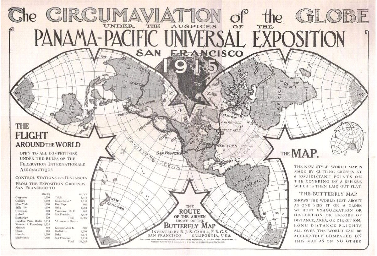 Cette carte, à l’aspect surprenant, a vu le jour en 1915, à l’exposition universelle de l’ouverture du canal de Panama, à San Francisco. A cette occasion J.S Cahill, un architecte de profession, présente sa « Butterfly Map » en réaction aux cartes en vigueur qu’il trouve inappropriées et source de distorsions exagérées : » [Il faut] encourager et habituer la nouvelle génération à avoir une vision planétaire, plutôt que la vision paroissiale [de l’époque] qui est d’une arrogance intolérante et qui menace la paix dans le monde dans de si nombreux pays. » [1] La carte eu un fort impact visuel et J.S Cahill reçut une médaille d’or à l’Exposition pour son travail de cartographie.