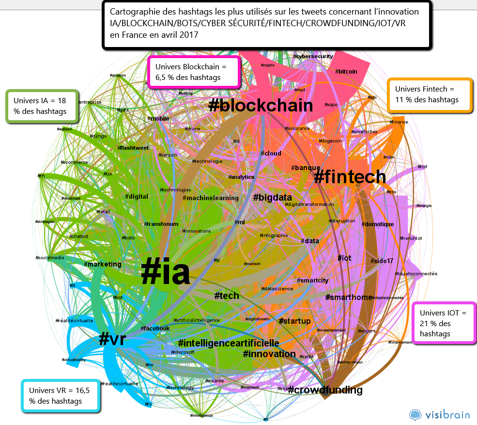 Enfin, certains hashtags sont à la fois très utilisés et en relation avec de nombreux autres hashtags : c’est notamment le cas de « #ia⁵ » ou « #fintech⁶ », que l’on peut donc qualifier de hashtags « centraux » au sein de ce réseau.