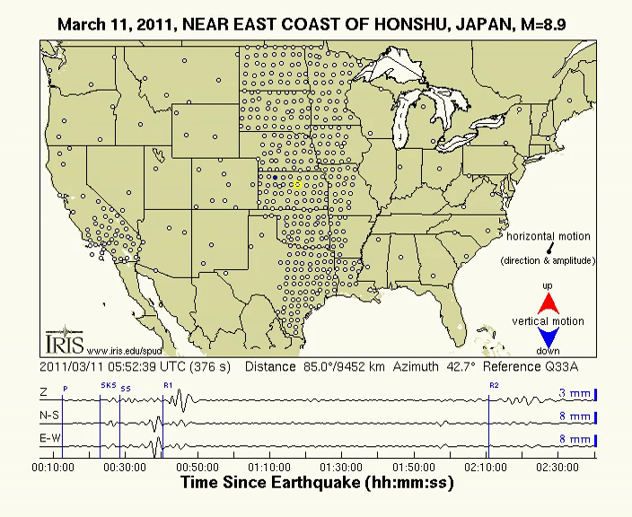 Le vendredi 11 mars 2011 à 5 :46 :27 UTC, un séisme de magnitude 9.1 Mww [a] frappe la côte de Honshu, au nord-est du Japon [1] . Il provoquera un tsunami de plus de 40m de haut, et causera la mort et la disparition de plus de 20 000 personnes. L’onde de choc et le tsunami engendreront la catastrophe nucléaire de Fukushima, la plus terrible de l’histoire après Tchernobyl. Ce séisme s’est produit à faible profondeur (25 km) dans la zone de subduction japonaise, où la plaque tectonique pacifique plonge vers l’ouest sous la plaque nord-américaine à une vitesse de environ 83 mm.an-1 [2]. L’onde de choc a été si puissante que les ondes sismiques ont fait plusieurs fois le tour de la Terre, elles ont notamment été captées à plus de 1000km de là, par le réseau sismique américain USarray. Un réseau très dense de capteurs sismiques :
