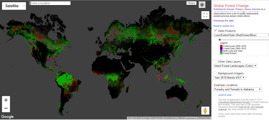 L’année 2019 a connu une déforestation particulièrement sévère à l’échelle globale, comme l’a montré le cas des incendies en Amazonie au cours de l’été, choquant l’opinion publique. De nombreux laboratoires se penchent depuis des années sur le thème du changement climatique et plus particulièrement de la déforestation. La carte interactive du laboratoire de recherche Global Land Analysis & Discovery du département Geographical Sciences de l’Université du Maryland, sous la direction de M.C. Hansen s’inscrit dans ce sujet.