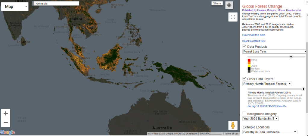 Avec cette carte interactive, l’utilisateur peut choisir d’afficher différentes données disponibles dans plusieurs listes déroulantes situées sur le ruban droit de la carte. Dans la première liste, il est possible de sélectionner différentes couches comme l’expansion, la régression ou encore le pourcentage des forêts sur plusieurs années. Une couche est également présente pour assembler les multiples paramètres en une unique visualisation (figure 2). Ainsi on peut observer les zones ayant subi le plus de déforestation entre 2000 et 2018. La deuxième liste déroulante permet de distinguer sur la carte les différents types de forêts. La troisième catégorie de couches regroupe les données plus brutes des images Landsat en reprenant des ensembles de bandes qui donnent des indications sur l’ensemble des occupations du sol dans le monde. Pour chacune des couches disponibles, l’opacité est modifiable ce qui permet ainsi de comparer des informations des différentes listes entre elles. Enfin, l’équipe du laboratoire présente une suggestion de différents zooms (Figure 3) dans une dernière liste déroulante, là où les changements sont les plus importants. Il faut zoomer par endroit pour vraiment ce rendre compte de l’état de la forêt. Ci-dessous, il s’agit d’un zoom sur l’Indonésie, cette région est l’une des plus touchée dans le monde par la déforestation.