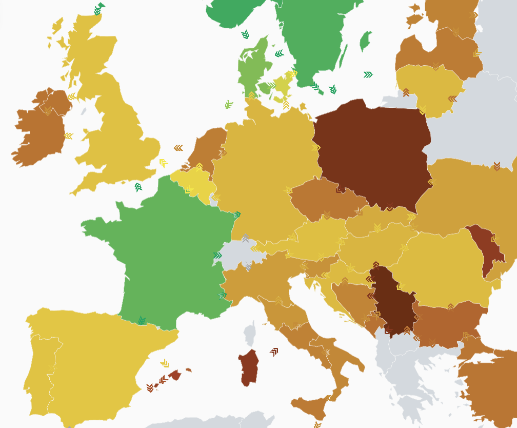 La palette de couleurs est comprise entre le vert, signifiant une faible émission de gaz à effet de serre, au marron foncé, indiquant de fort rejet de CO2 de la production ou de la consommation. Il possible de connaître la quantité d’électricité exportée entre les zones mitoyennes ainsi que leur intensité carbone grâce aux flèches entre les secteurs. Lorsque l’on clique sur une zone, il est possible d’avoir de nombreuses informations concernant sa consommation et ses émissions par type de production d’électricité.