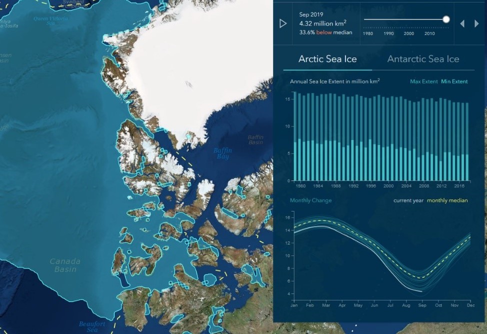 Afin de sensibiliser et d’informer le grand public sur les impacts du changement climatique dans les régions polaires, une multitude de cartes et d’infographies ont émergées ces dernières années. L’application Sea Ice Aaware présentée ici a été réalisée par des membres d’ESRI et fait partie intégrante du projet « ArcGIS living Atlas of the world ». Ce site internet mis en place par ESRI vise à produire ou promouvoir des cartes et applications dynamiques qui abordent des thématiques sous un angle innovant et interactif. Cet Atlas permet aux utilisateurs d’ArcGIS de produire de nouvelles cartographies ou d’enrichir les productions existantes grâce à de nouvelles données, dans l’optique de contribuer à la création d’un « SIG mondial ».