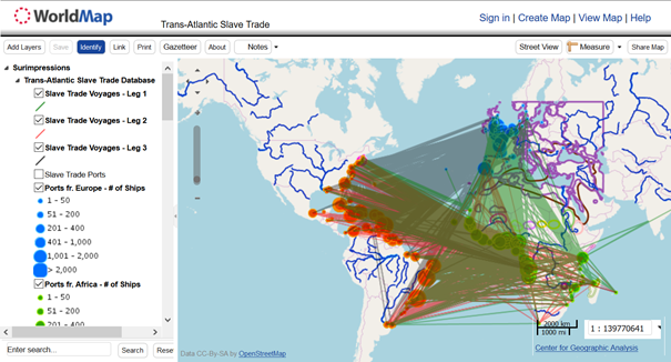 L’initiative de ce projet, porté par l’université Harvard (Center for Geographic Analysis), est de contextualiser les bases de données spatiotemporelles en permettant l’intégration de nombreuses données annexes. Au sein de ce vaste projet, se retrouve la carte du commerce triangulaire qui fait l’objet de ce billet.