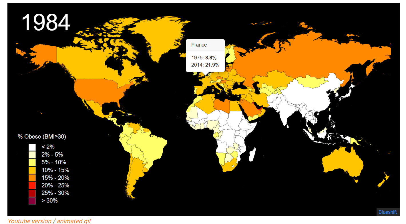Depuis 1975, la part des personnes souffrant d’obésité a triplé dans la population mondiale. Devant cet enjeu majeur de santé public et pour comprendre cette augmentation pays par pays, Max Galka, un entrepreneur américain et professeur auxiliaire en gestion et visualisation des données à l’université du Pennsylvanie a publié sur son blog metrocosm une géovisualisation retraçant l’évolution de l’obésité de 1975 à 2014. Cette carte publiée en 2016 montre que sans exception, les taux d’obésité ont augmenté dans tous les pays du monde. Les données pour construire cette carte proviennent d’un article publié dans The Lancet compilant 1698 études sur les tendances de l’IMC concernant 19.2 millions d’individus au total provenant de 200 pays du monde.