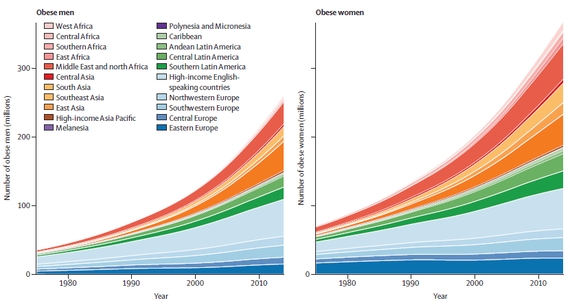 L’obésité progresse clairement et de manière significative dans toutes les régions du monde autant chez les hommes que chez les femmes. L’étude montre une augmentation de 3,2% à 10,8% chez les hommes et de 6,4% à 14,9% chez les femmes durant cette période. Elle augmente plus dans les pays dits du « tiers-monde » que dans les pays développés. En 2013, 62% des personnes obèses vivaient dans des pays en voie de développement. D’après le rapport de 2014 du think tank britannique The Overseas Development Institute (ODI), trois facteurs peuvent expliquer en grande partie cette évolution : le changement alimentaire lié à l’augmentation du pouvoir d’achat, un style de vie urbain et moins d’exercices physiques.