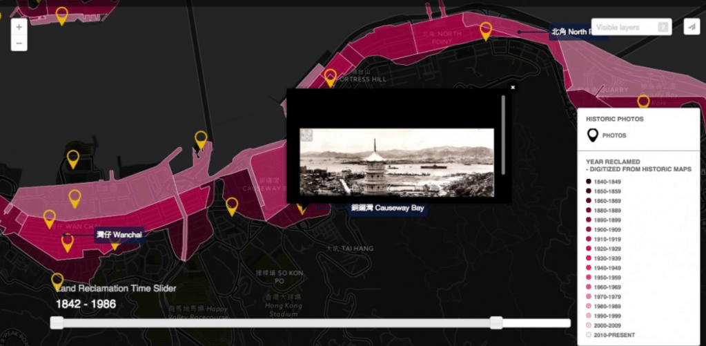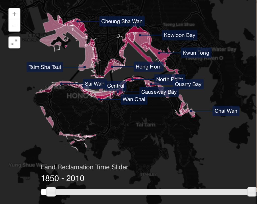 Cette application de cartographie vise à fournir des références spatio-temporelles aux projets de terre-plein qui ont considérablement transformé la ville. L’interfaçage de données géographiques et de photos historiques aide à comprendre l’évolution du littoral de Hong Kong entre 1843 et 2010.