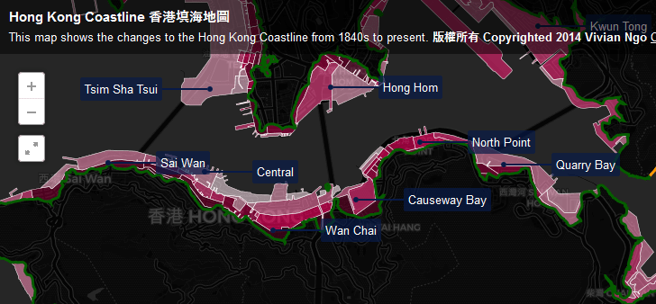Cette carte interactive est intéressante parce qu’elle aborde la question de la politique de développement sur la mer dans une espace où les terres aménageables sont rares. Elle permet aux citoyens d’observer l’évolution du littoral à Hong Kong entre 1850-2010, période durant laquelle cette ville s’est beaucoup développé et a beaucoup changé d’un point de vue économique et de l’environnement. Les citoyens peuvent mesurer la proportion des surfaces qui ont été gagnées sur la mer pour avoir plus de place, et penser à leurs apports aussi bien qu’à leurs impacts. Cela peut aider aux discussions publiques sur les projets de terre-plein.