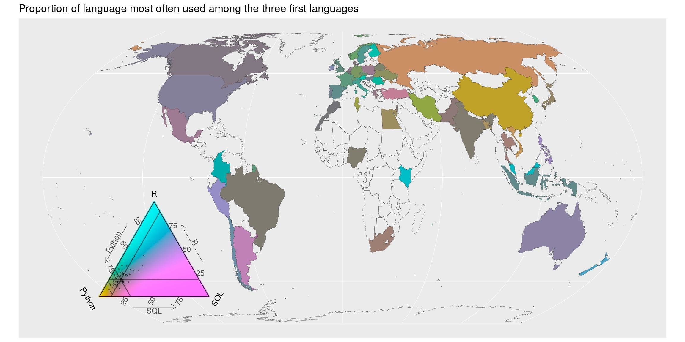 Il a pour objectif de savoir quels sont les langages les plus utilisés entre R, SQL et Pyhton (trois langages très utilisés dans la géomatique). Pour réaliser la cartographie (figure 2), il a procédé à une méthode particulière, qui est dans un premier de calculer la moyenne mondiale d’utilisation des trois langages, puis de calculer la moyenne par pays avant de calculer l’écart à la moyenne pour faire ressortir les utilisations plus spécifiques des pays. Enfin une fois l’écart à la moyenne obtenu pour tous les pays et tous les langages, il colorise les pays à travers un diagramme triangulaire. Plus un pays utilise un langage plus sa position tendra vers une des pointes du triangle et sa couleur sera « pure ».