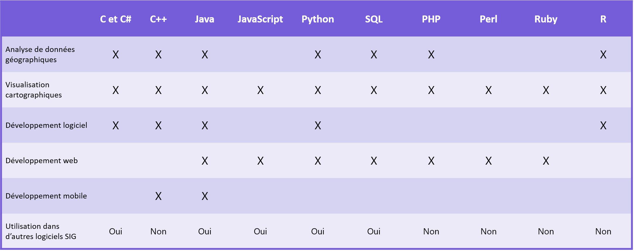 Voici un tableau récapitulatif des différents usages et avantages des langages de programmations SIG: