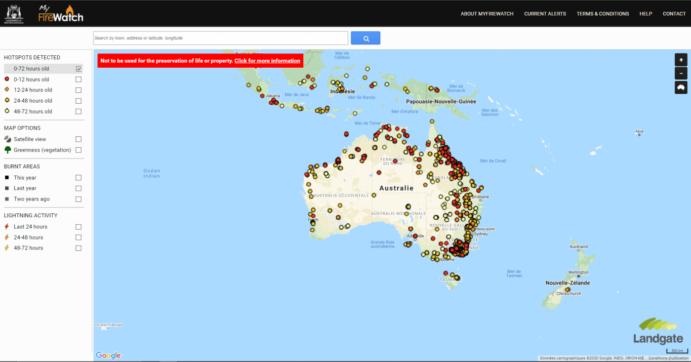 - Les dernières zones d’incendies recensées selon 5 tranches horaires (0-12h, 0-24H,24-48H…. représentées par des points allant du rouge (les plus récentes) au jaune (les moins récentes) selon l’heure à laquelle elles ont été détecté(es).