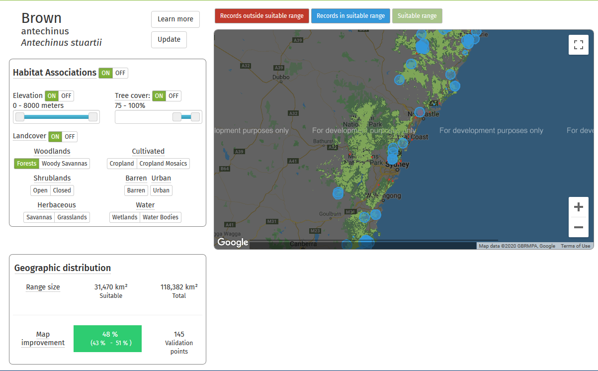 Cette représentation utilise le Google Engine afin de proposer une visualisation très précise de ce qu’ils définissent comme la « zone d’habitat souhaitable » pour une espèce. Ainsi, l’application permet de voir la zone d’habitat souhaitable d’un animal à partir des caractéristiques de l’habitat idéal pour ce type d’espèce. C’est-à-dire le type d’habitat dans lequel l’espèce en question serait le plus à l’aise. Les différentes observations de l’espèce en question sont aussi affichées sur la carte et peuvent témoigner de la présence de cette espèce hors de sa zone idéale. Un nombre élevé d’observations hors zone pourrait mettre en avant un déséquilibre dans l’habitat de l’espèce en question et initier de nouvelles mesures comme la création de réserves naturelles.