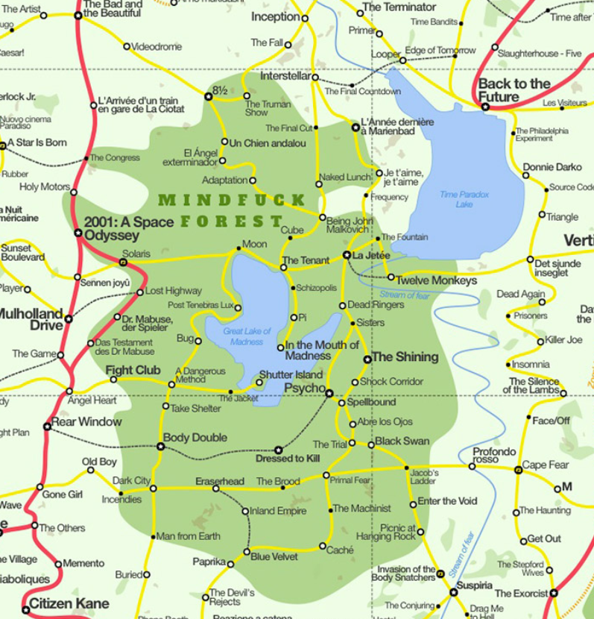L’auteur a également figuré des éléments de paysage comme des forêts, des rivières, des lacs ou encore des mers. Ceux-ci semblent souvent placés au hasard, selon les envies de l’auteur. Certains de ces éléments prennent néanmoins une signification cartographique forte et permettent de mettre en exergue les films situés à proximité. Le paysage fait alors écho au synopsis du film, avec par exemple la Mindfuck Forest où Shutter Island est représenté sur une île au milieu d’un lac (figure 1).