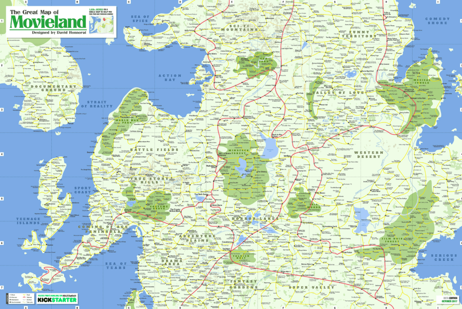 On connait tous cette difficulté de choisir un bon film à regarder. Ce n’est pas une chose facile avec les dizaines de bons films produits chaque année qui viennent eux-mêmes enrichir un historique vieux de plusieurs décennies. David Honorat propose une manière originale pour réussir à s’orienter dans cette masse foisonnante de films. Il a eu l’idée originale de se détacher des listes habituelles de classement des films, et d’opter pour une représentation plus graphique. De cette idée, est née The Great Map of Movieland, une carte reliant plus de 1800 films dans un style imitant celui des cartes routières.