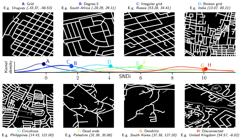 Restant alors à catégoriser cet étalement, leur idée est d’établir un indice pour mesurer la connectivité du réseau routier : le « Street-Network Disconnectedness index » (SNDi). Pour ce faire, ils ont recours à OpenStreetMap (OSM) et quelques données satellitaires. OSM leur permet ainsi d’accéder à une base de donnée précise contenant 46 millions de kilomètres de rues à l’échelle mondiale. L’exploitation de celle-ci sous la forme d’un graphe routier a déjà contribué à d’autres applications, comme l’analyse de l’organisation spatiale du réseau routier urbain. Considérant des principes d’organisation spatiale et des historiques de développement urbain différents selon les pays voire les continents, ils calculent une série de 13 mesures à travers le graphe routier, dont les grandes familles sont les suivantes : le degré de connexion nodale pour chaque intersection, la dendricité (c.-à-d. l’arborescence), la « circuité » (rapport entre la longueur du chemin et la distance en ligne droite aux autres nœuds) et la sinuosité (rapport entre la longueur et la distance de bout en bout pour chaque chemin) (Fig. 3).