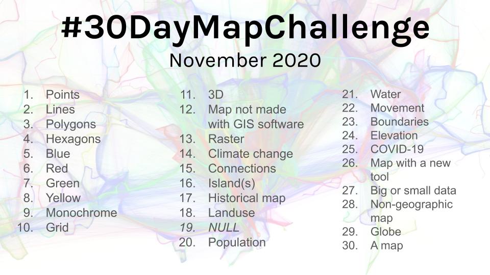 Publications mentionnant le hashtag #30DayMapChallenge 2020 sur Tweeter: https://twitter.com/search?q=%2330DayMapChallenge&src=typed_query