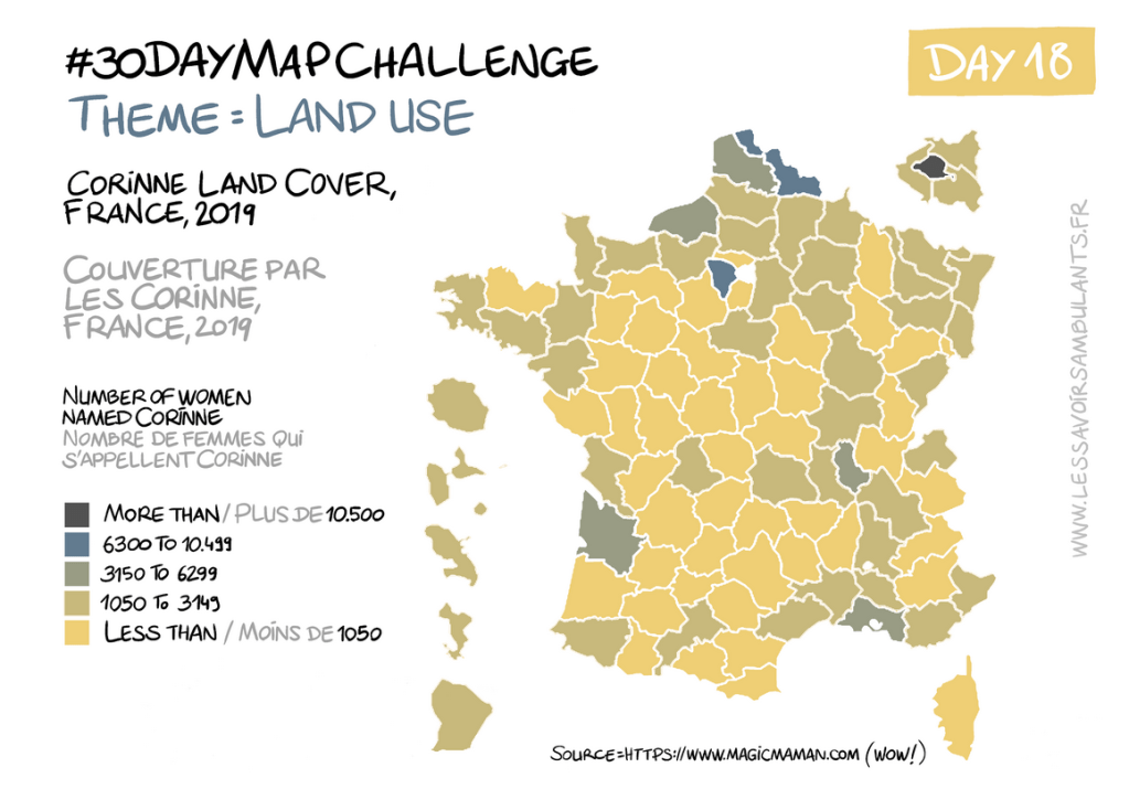 Aucune prétention scientifique derrière ces cartes donc, si ce n’est celle de questionner les thématiques proposées avec humour et légèreté. Association entre médiation scientifique et humour qui fait justement tout le charme de leurs cartes, souvent absurdes et toujours drôles pour apporter un regard frais sur ces 30 thématiques. Petit tour d’horizon des pépites de leur #30DayMapChallenge.