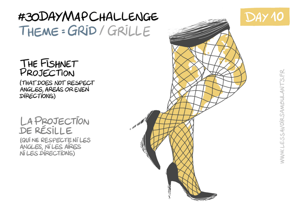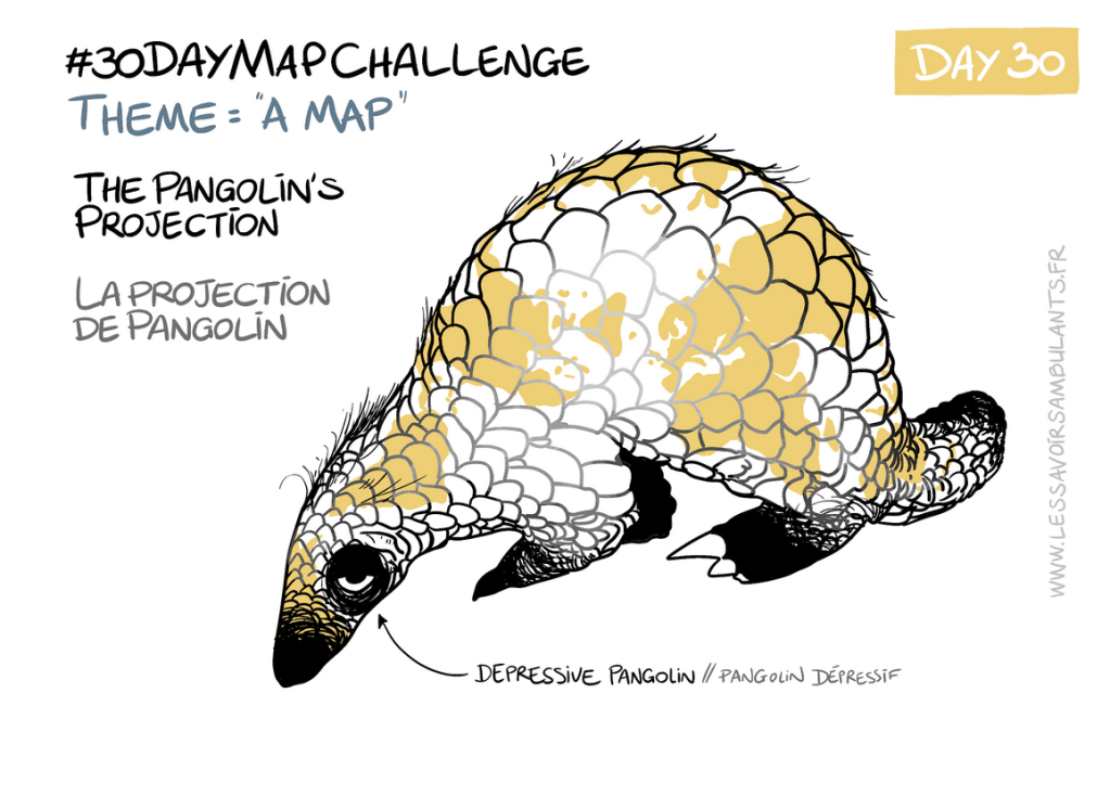 Vous avez peut-être déjà entendu parler du « scandale de Mercator », cette mini bande dessinée des Savoirs Ambulants qui retrace, toujours avec beaucoup d’humour, l’histoire des projections utilisées dans les planisphères pour remettre en question notre vision du monde (littéralement). On retrouve cette question des projections dans leurs cartes du #30DayMapChallenge, avec deux nouvelles projections (iné)dites de « résille » et de « pangolin ». Sur la thématique de la grille, la projection de « résille » (en référence aux collants) « ne respecte ni les angles, ni les aires, ni les projections » et n’est pas tant là pour habiller la carte. Au contraire c’est plutôt la carte-dessinée qui vient habiller cette projection qui parait alors presque accessoire (Figure 3). Projection également relayée au second plan dans la dernière carte du mois pour laisser place au dessin de ce pangolin fatigué (Figure 4). Pangolin qui prend ironiquement toute la place sur la carte, de même que dans notre quotidien en ces temps de pandémie mondiale de COVID19.