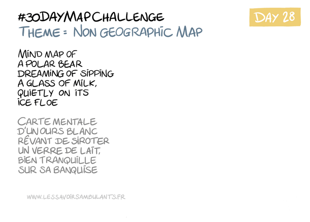 Implication du lecteur encore une fois mise à l’oeuvre dans la « carte mentale » du jour 28 sur le thème « carte non géographique » (Figure 6). Le lecteur n’y est plus simplement un consommateur passif de la carte mais il en est le créateur en devant faire appel à son imagination pour penser ces enjeux climatiques. Guidé par l’image ici détournée de l’ours polaire sur sa banquise suggérée par le texte, le lecteur peut laisser libre court à son imagination pour repenser autrement ce symbole du réchauffement climatique, qui n’apparait ironiquement pas sur la carte du fait de sa couleur blanche.