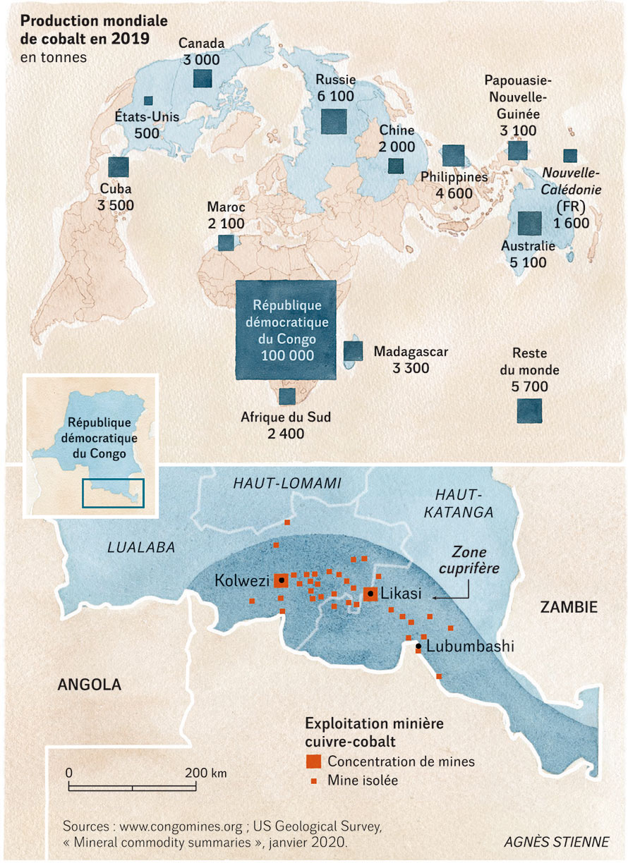 Cet article expose, à travers la carte, la distribution inégalitaire du cobalt dans le monde. De plus, l’auteur met un point d’honneur à dénoncer les conditions humaines de son extraction, notamment celles des enfants. Ce métal est en effet devenu incontournable à l’époque actuelle, et de plus en plus prisé avec l’arrivée de la 5G. « Alors que la transition mondiale vers la technologie 5G s’accélère, la croissance des marchés excluant les véhicule électriques a un grand potentiel de croissance sur deux fronts spécifiques : les portables et les systèmes de stockage d’énergie », ont déclaré les analystes de Benchmark Mineral Intelligence.