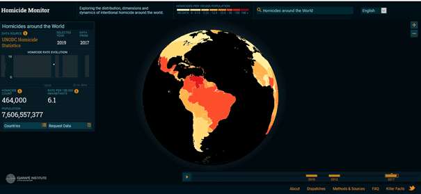 C’est dans le but de matérialiser et d’imager les statistiques et les données recensées que l’« Homicide Monitor » a vu le jour. Il s’agit d’une carte interactive qui recense les meurtres à travers le monde. Nous pouvons y explorer la distribution, les dimensions et la dynamique de l’homicide intentionnel dans le monde.