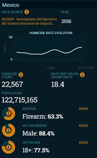 Une fois sur la carte, on a la possibilité de se promener à travers le monde avec une vision assez claire du taux d’homicides par pays. Les pays ayant les taux les plus élevés sont représentés en rouge. La carte fournit en plus des données telles que le profil des victimes, le type d’arme le plus utilisé, la tranche d’âge la plus touchée. Ces données sont également disponibles à l’échelle des villes pour certains pays. Nous pouvons également observer l’évolution de ces données au fil du temps.