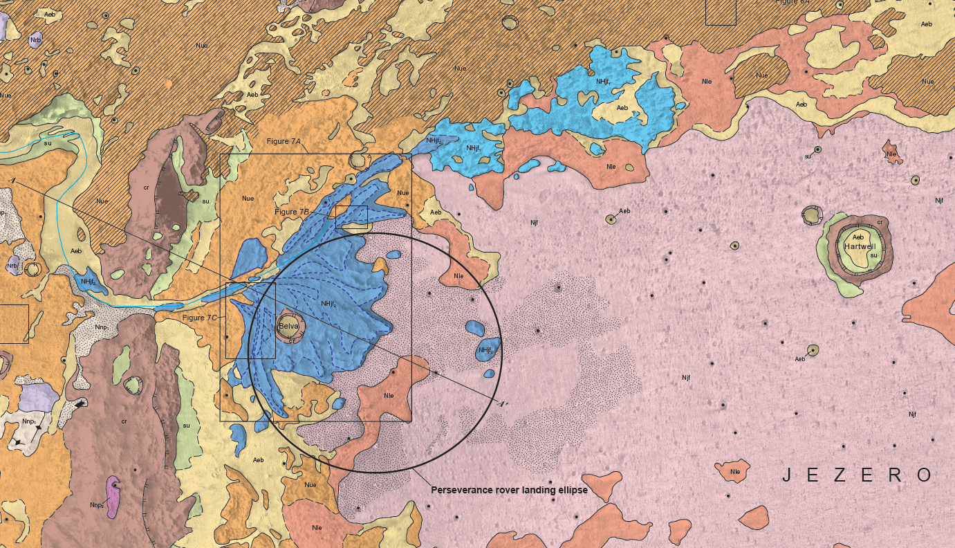 Grâce à cette carte, les astronautes sont en mesure de mieux apprécier le terrain pour l’atterrissage des futures missions martiennes. « La carte permettra aux chercheurs de mieux évaluer les sites potentiels d’atterrissage pour les futures missions qui nous aideront à mieux comprendre l’histoire de la planète. Elle offrira un contexte géologique pour les scientifiques pendant des années », conclut ainsi Suzette Kimball, directrice de l’USGS, lors de la publication de la carte en 2014. Pour citer un exemple récent, l’USGS a fourni à la NASA en 2020 une version plus détaillée de la zone géographique où se situe le cratère d’impact Jezero afin de localiser le site d’atterrissage du rover Persévérance (figure 6). Vous pouvez télécharger la totalité de cette carte à l’aide de ce lien ici. Ce fichier comprend également d’autres informations comme des élévations de terrain.