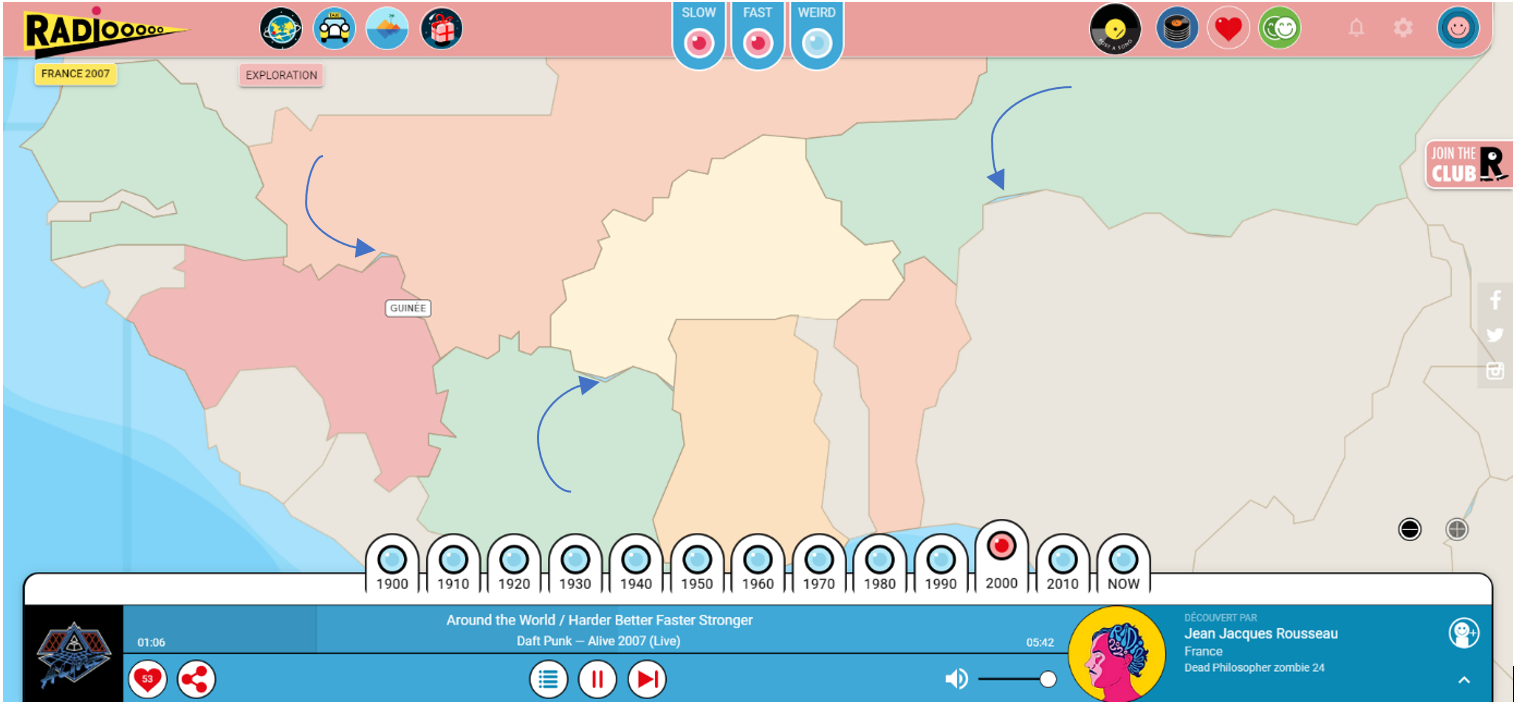 Radiooooo est une web radio (également disponible sur Android et iOS) se présentant sous la forme d’une mappemonde interactive (figure 1). L’application, au design vintage et coloré (dont Noemi Ferst est en charge de la direction artistique et s’occupe de toutes les illustrations), est ludique et facile à prendre en main. Il suffit de choisir une destination, une époque et une ambiance parmi les trois proposées : tempo lent (slow), tempo rapide (fast), curiosités (weird) ou alors les trois en même temps et le tour est joué, la playlist est lancée ! Il n’y a plus qu’à écouter ces nouveaux rythmes et sonorités du monde entier, actuels ou du siècle dernier. Laissez-vous bercer !