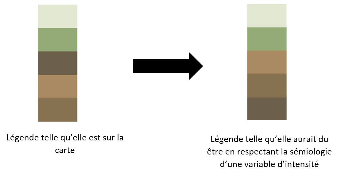 La carte (figure3), réalisée par Nami, est extraite du générique de début de la série animée. Nous pouvons voir qu’il manque plusieurs éléments principaux comme l’échelle et la légende. En revanche, force est de constater qu’un maillage a été mis en place pour faciliter la navigation. Nous savons donc qu’il existe un référentiel local (similaire aux latitude et longitude de notre monde) imaginé par Nami. Les couleurs de ce qui semble être une carte de l’altimétrie des iles est aussi critiquable car le dégradé de couleurs devrait s’intensifier (du plus clair au plus sombre) alors que nous pouvons voir que le dégradé de couleur redevient clair après la couleur la plus foncée. Voici un exemple (figure 4) de ce à quoi aurait dû ressembler les couleurs de l’altimétrie :