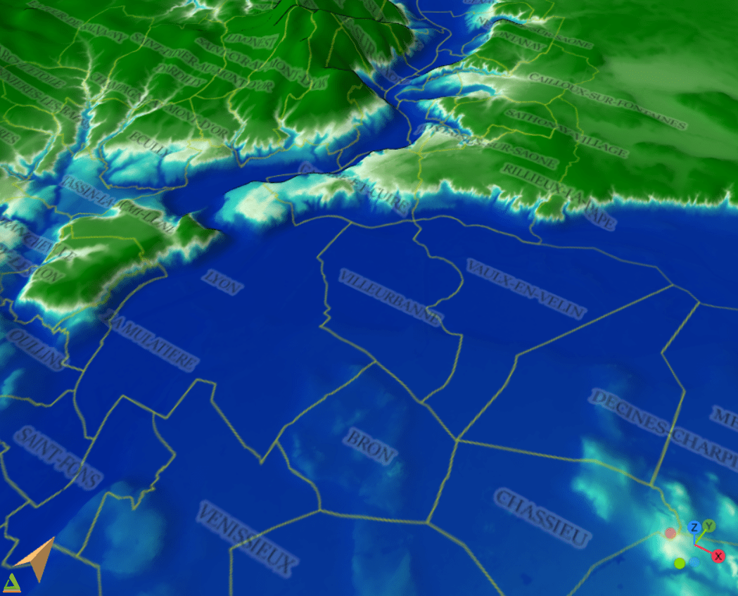 Ni une, ni deux, je fonce sur le site de l’IGN pour télécharger les données la BD Alti du Rhône et sur data Grand Lyon pour les limites des communes Grand Lyon. QGIS propose une palette Caribbean qui fera parfaitement l’affaire. Un consensus rapide estime qu’avec une montée des eaux de à 250m, l’écume des rouleaux s’étalera juste devant mon portail. Un tuto, fluide et clair du plugin QGIS2threeJS, complète la recette pour obtenir un rendu 3D plutôt cool. 10 crashs de QGIS et une grosse exagération des reliefs (altitude x5) plus tard, voici la carte de la métropole de Lyon avec un niveau de mer surélevée de 250m (figure 3) dans laquelle vous pourrez naviguer!