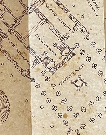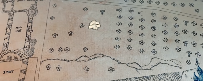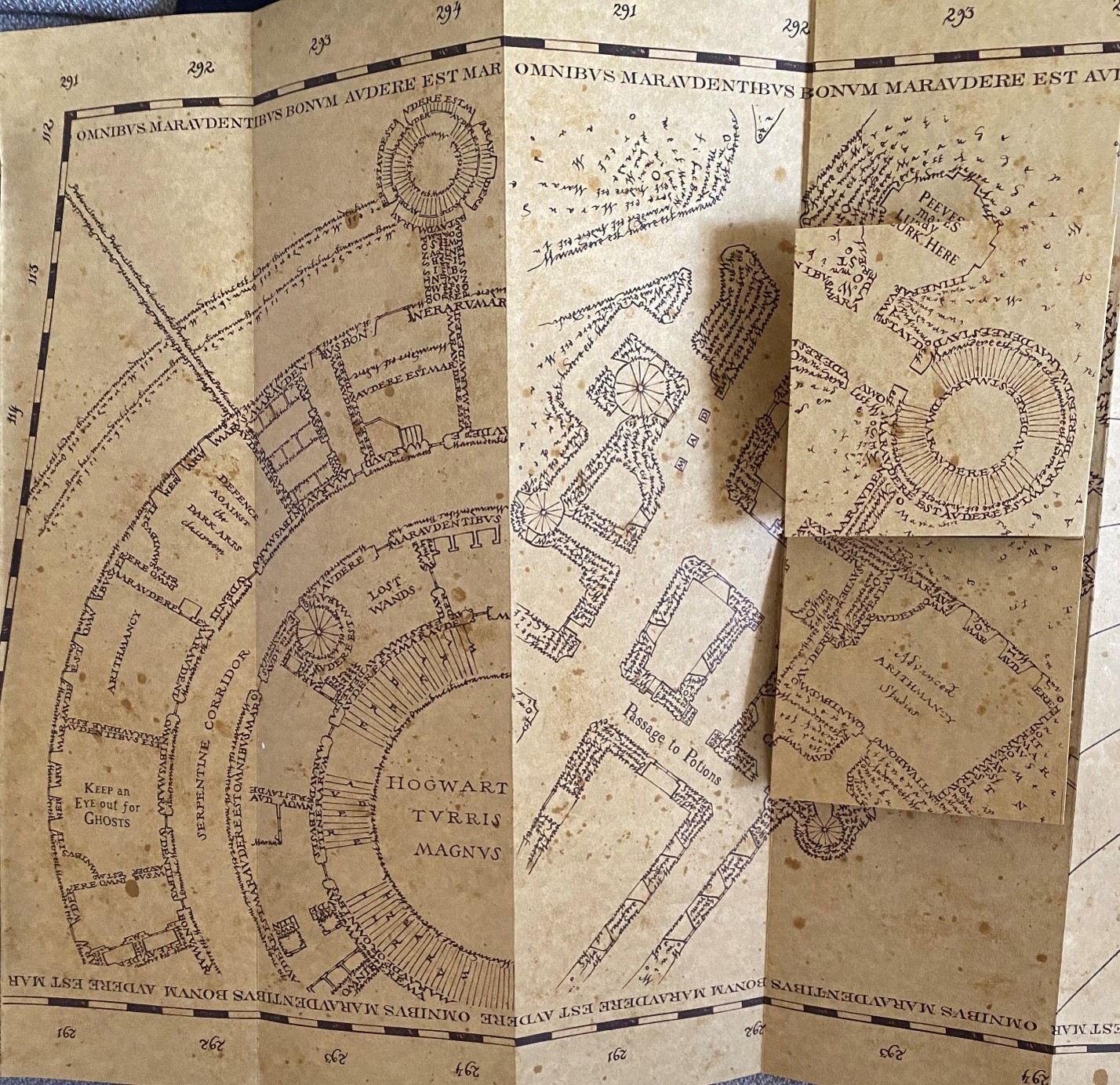Pour revenir sur la carte de façon générale et plus critique, on s’aperçoit très vite qu’elle relève du monde fantastique malgré le fait que ce soit un bel objet (bien que ce soit un avis tout à fait subjectif). Certains détails comme le manque de continuité entre les bâtiments, en fonction des plis du parchemins, amènent un certain sentiment d’incohérence. Il est quand même bon de rappeler une nouvelle fois, que ce château est tout simplement fictif et donc difficilement cartographiable, même si ce n’est peut-être pas le cas dans la tête de l’auteure, J.K. Rowling…