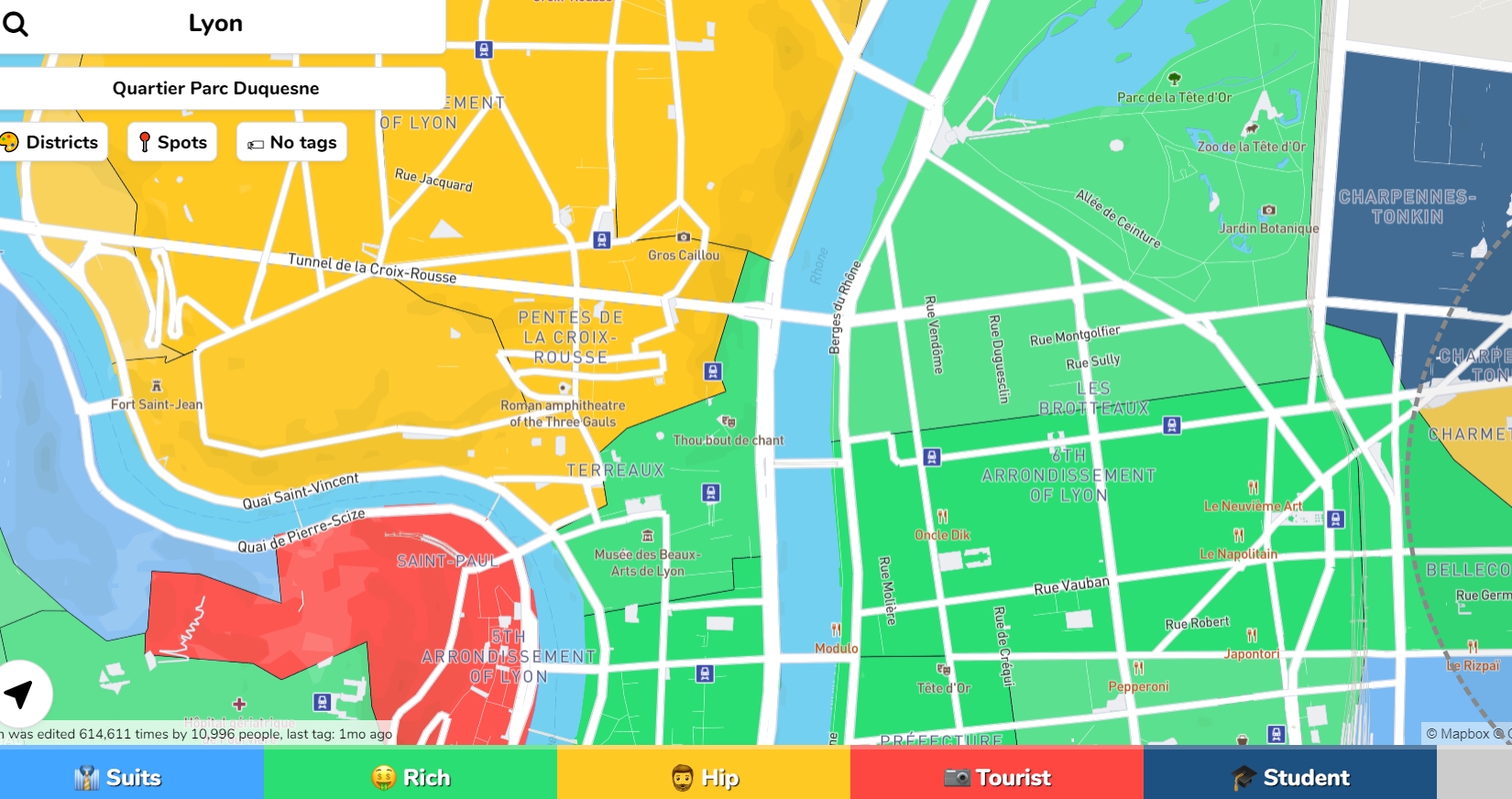 Pour le classement des types de zones, l’usager peut cliquer sur l’icône pinceau en haut à droite et peindre lui-même les zones respectives avec la couleur (ou type) de son choix. L’affichage final se fait en fonction du nombre des peintures de la même couleur sur les mêmes zones. Si, par exemple, 8 personnes classent une zone comme touristique, mais 14 autres personnes la classent comme “hip”, c’est cette dernière qui va prédominer sur la carte finale (la zone sera en jaune). Il n’y a rien d’immuable, et ce classement peut toujours changer en fonction des réactions des usagers.
