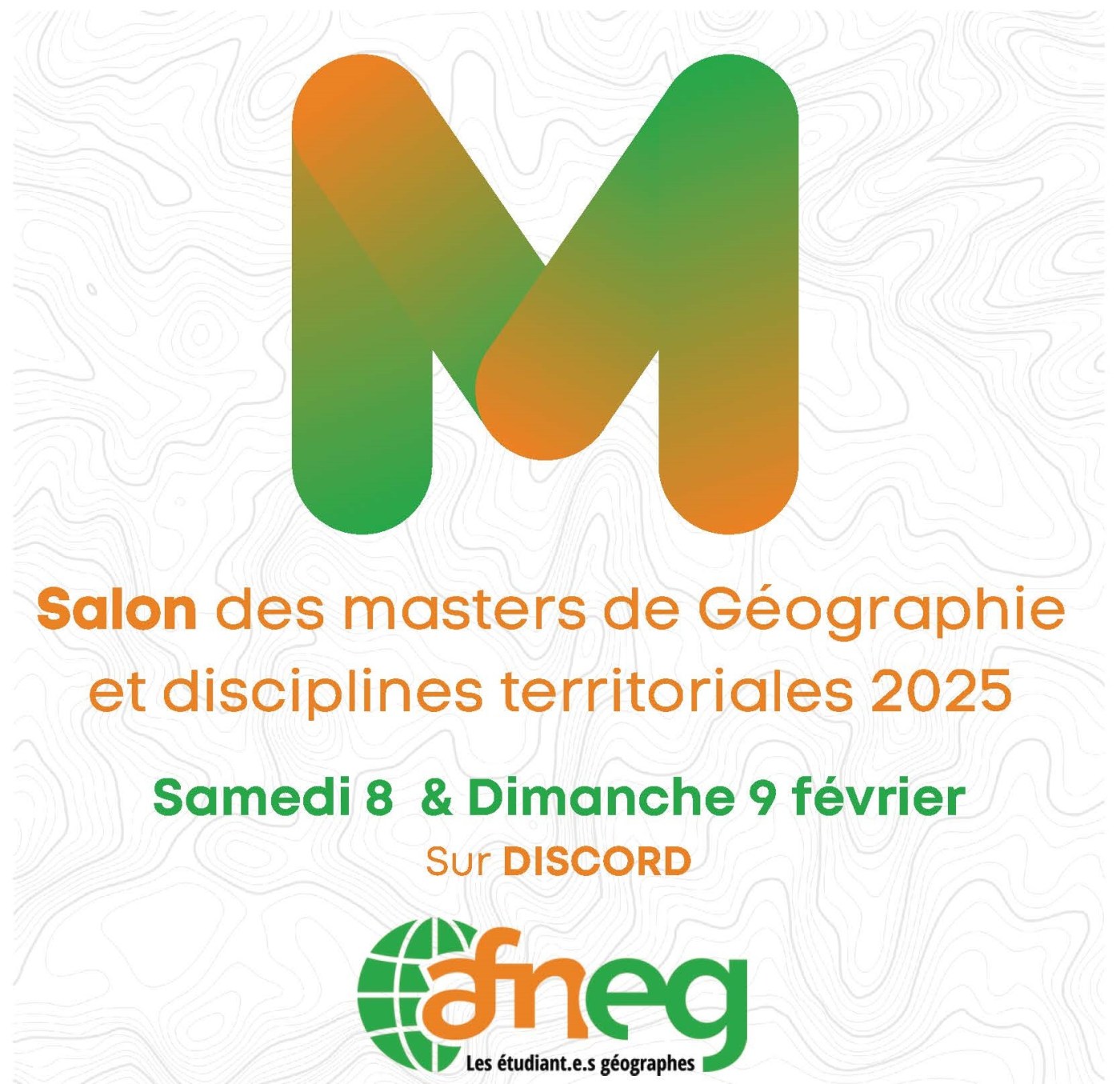 L’AFNEG, Association Fédérative Nationale des ÉtudiantEs en Géographie, Aménagement, Urbanisme, Environnement et Disciplines territoriales organise la 5ème éditions du Salon des Masters, les 8 et 9 février prochains sur Discord. Pour rejoindre le discord : https://discord.gg/5a4JcgNayG