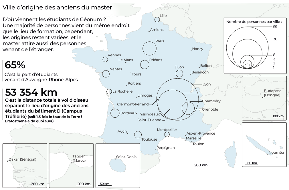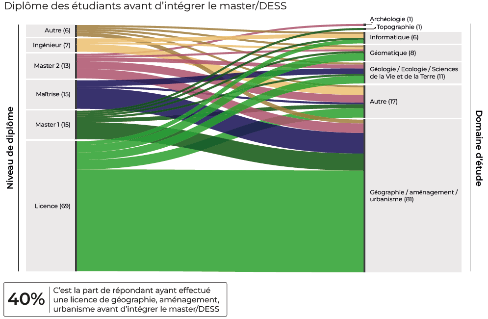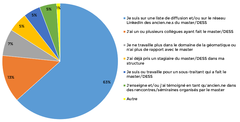 L’enquête ciblait le profil professionnel des “ancien·es”, leurs conditions d’emploi, et leurs liens avec le master/DESS; elle a été conçue et dépouillée par la promo 2024 de M2 GeoNum dans le cadre du cours “compétences professionnelles” avec Claire Cunty: Florian Cosse, Zineb Eddahmani, Hajar El Malki, Matheus Gimenez Saraiva, Annaëlle Lanceart, Pierre Laroumanie, Jade Laufrais, Dominique Le Gal, Marceau L’Hospital, Thibaut Michou, Gwenaël Petavy, Nathan Radondy, Bastien Ribeyre, Etienne Rousseau, Julien Sauvinet, Juliette Seassal Martinet, Vistel Lutrand Tchako Happi, Pauline Viguier.