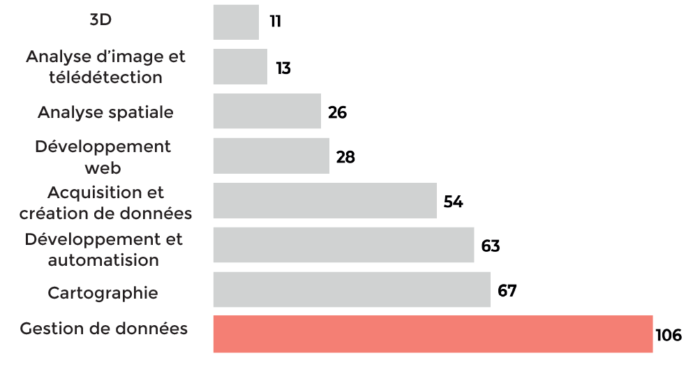 Les données sont au cœur du métier de géomaticien, mettant les tâches liées à la gestion et la création des données en 1ère position des tâches citées par les répondant·es. Associées à la cartographie, les tâches d’automatisation constituent le socle d’un métier qui s’apparentent aujourd’hui à celui des « Sciences des données » spécialisé sur les données géographiques. Les tâches associées au développement web ont pris une part aussi importante que celles associées au traitement des données et à l’analyse spatiale. Des compétences plus spécifiques comme la télédétection et la 3D apparaissent plus périphériques au métier.