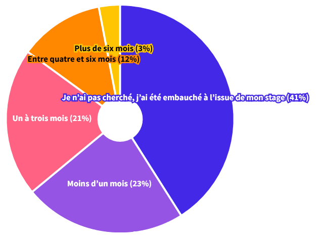 Une grande majorité (41%) des emplois sont trouvés à la sortie du master : prouvant que le stage de M2 est un vrai tremplin vers le monde professionnel. Le marché de l’emploi du domaine est toujours très dynamique: le temps moyen pour trouver un emploi est d’ 1 mois et demi