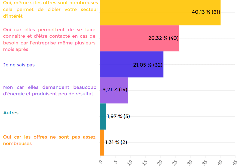 Environ 70%, des anciens diplômés recommandent de faire des candidatures spontanées dans la recherche de leur premier emploi. En effet, cela permet de cibler les secteurs d’intérêts et également de se faire connaitre pour de potentielles opportunités futures.