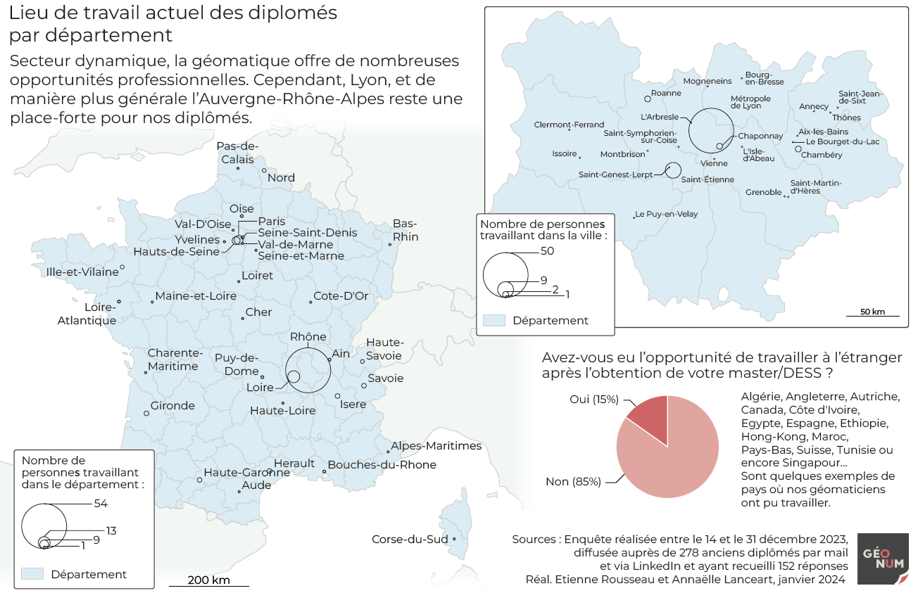 L’enquête ciblait le profil professionnel des “ancien·es”, leurs conditions d’emploi, et leurs liens avec le master/DESS; elle a été conçue et dépouillée par la promo 2024 de M2 GeoNum dans le cadre du cours “compétences professionnelles” avec Claire Cunty: Florian Cosse, Zineb Eddahmani, Hajar El Malki, Matheus Gimenez Saraiva, Annaëlle Lanceart, Pierre Laroumanie, Jade Laufrais, Dominique Le Gal, Marceau L’Hospital, Thibaut Michou, Gwenaël Petavy, Nathan Radondy, Bastien Ribeyre, Etienne Rousseau, Julien Sauvinet, Juliette Seassal Martinet, Vistel Lutrand Tchako Happi, Pauline Viguier.