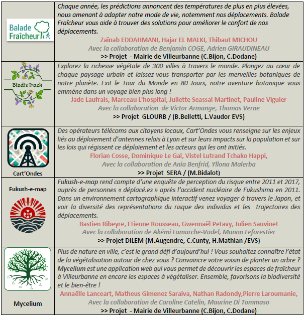 Les projets géonumériques 2024 Perceptions des risques à Fukushima commandé par le Projet DILEM (M.Augendre, C.Cunty, H.Mathian /EVS)Conception et réalisation (2024): Bastien Ribeyre, Etienne Rousseau, Gwennaël Petavy, Julien Sauvinet (Master Geonum) avec la collaboration de Akémi Lamarche-Vadel, Manon Leforestier (Master Sentinelles) Où planter à Villeurbanne? commandé par le service géomatique de la Mairie de Villeurbanne (C.Bijon, C.Dodane)Conception et réalisation (2024): Annaëlle Lanceart, Matheus Gimenez Saraiva, Nathan Radondy,Pierre Laroumanie (Master GeoNum) avec la collaboration de Caroline Catelin, Maurine Di Tommaso (Master Sentinelles) Partager : Partager sur X(ouvre dans une nouvelle fenêtre) X Partager sur Facebook(ouvre dans une nouvelle fenêtre) Facebook J’aime chargement…